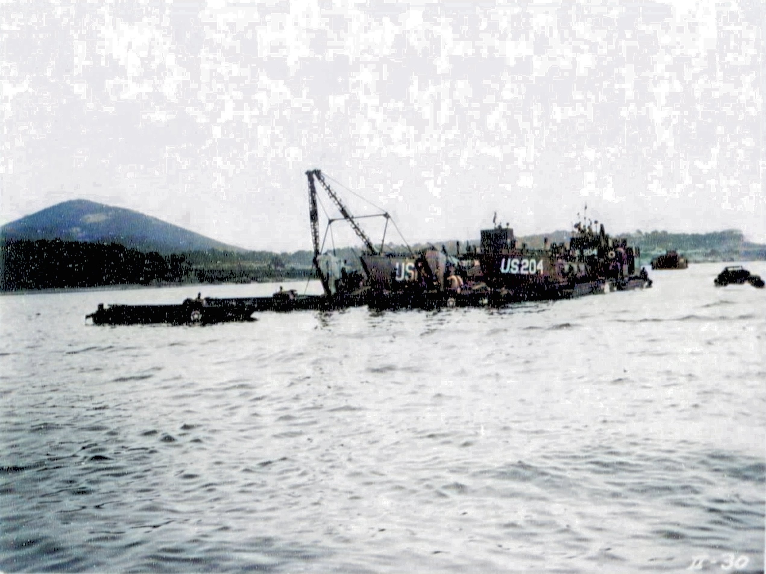 600k | LCT(5)-16 (on left with salvage crane) and LCT(5)-204, 17 August 17, Yellow Beach, Baie de Cavalaire,