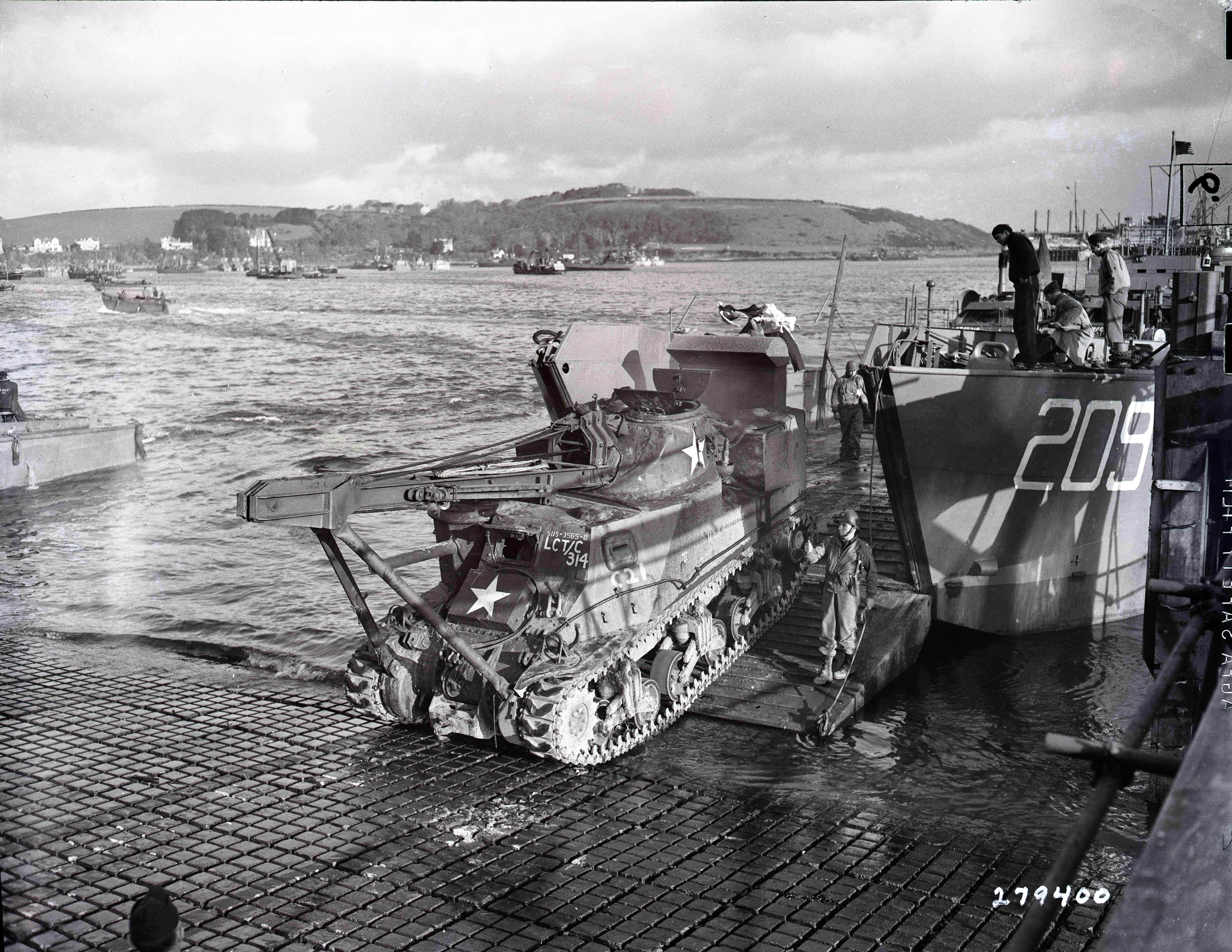 5771k | A U.S. Army M31 (T2) Tank Recovery Vehicle backs up the ramp during exercises with LCT(5)-209 at Falmouth, England, 30 December 1943