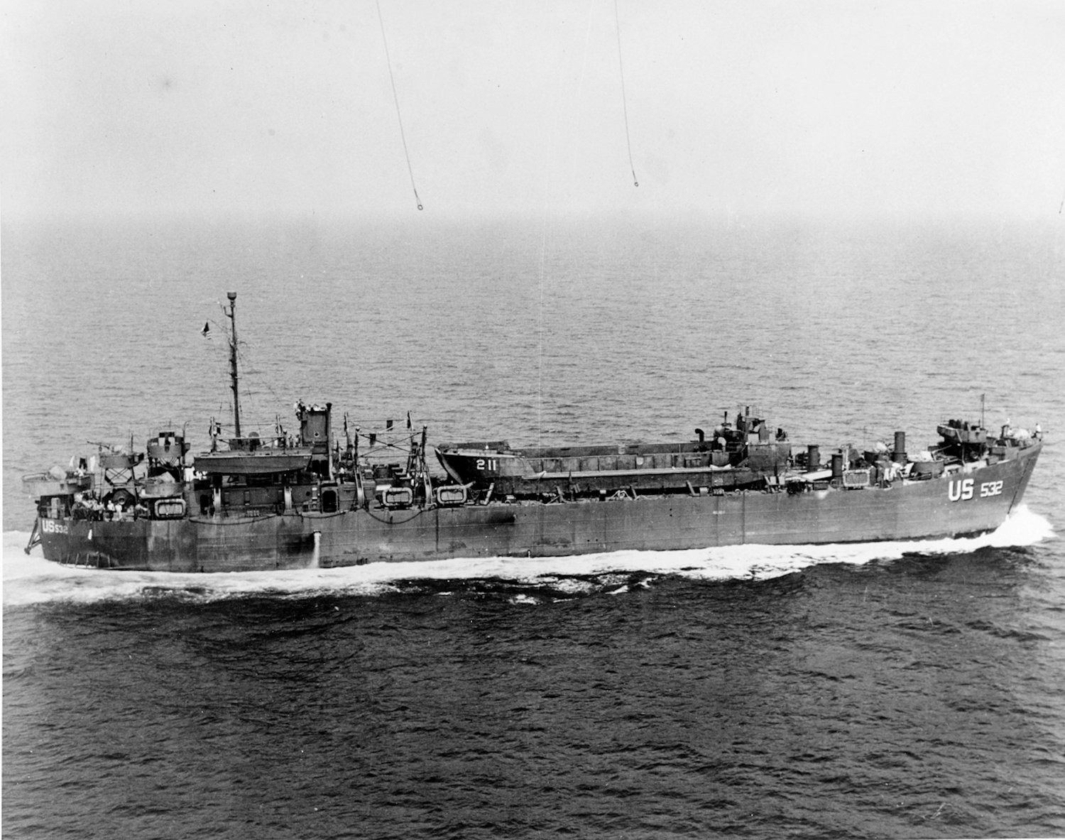 310k | USS LST-532 underway with LCT(5)-211loaded on her main deck, 4 July 1945.