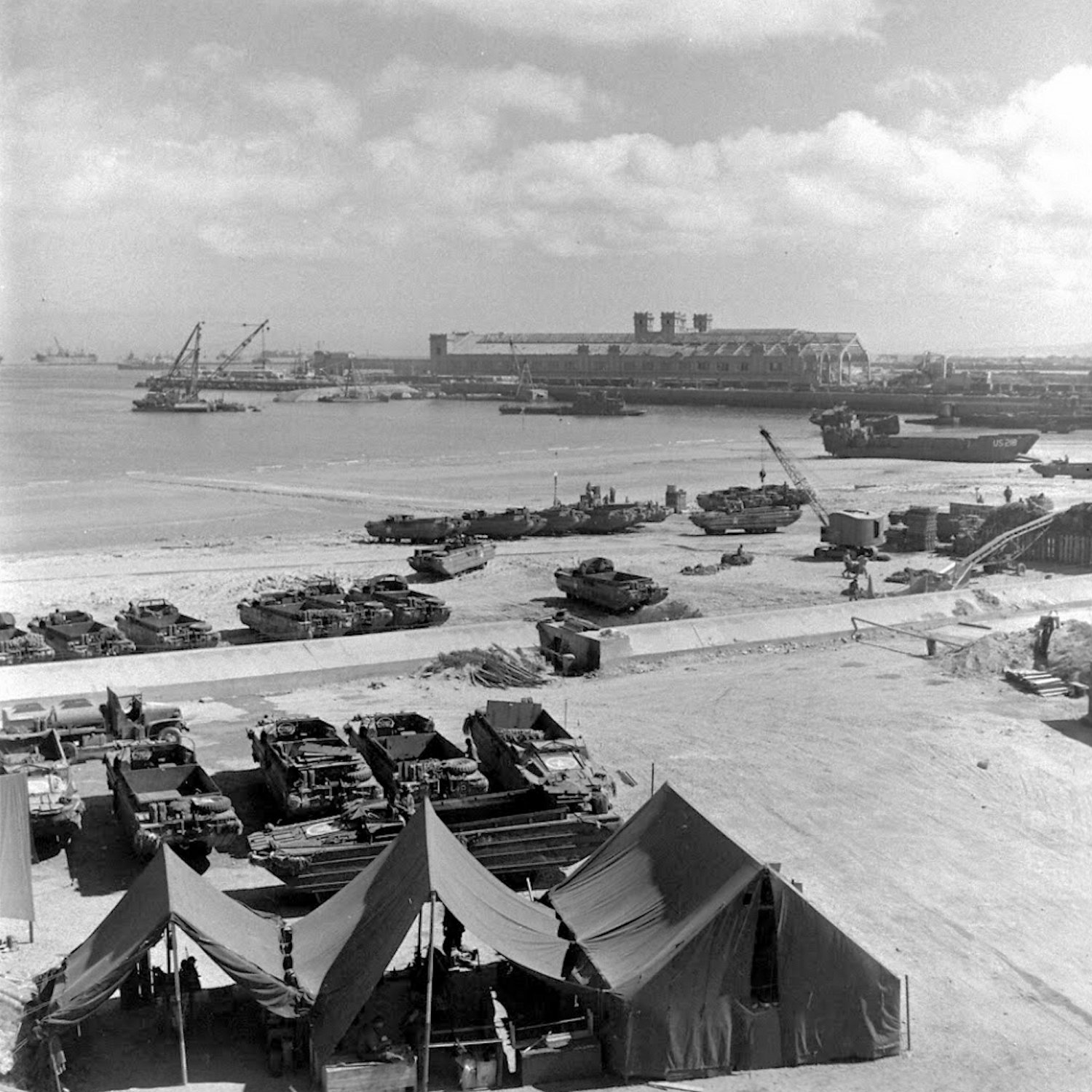 363k | LCT(5)-218 (far right) in the harbor at Cherbourg, France, at low tide, circa July/August 1944.