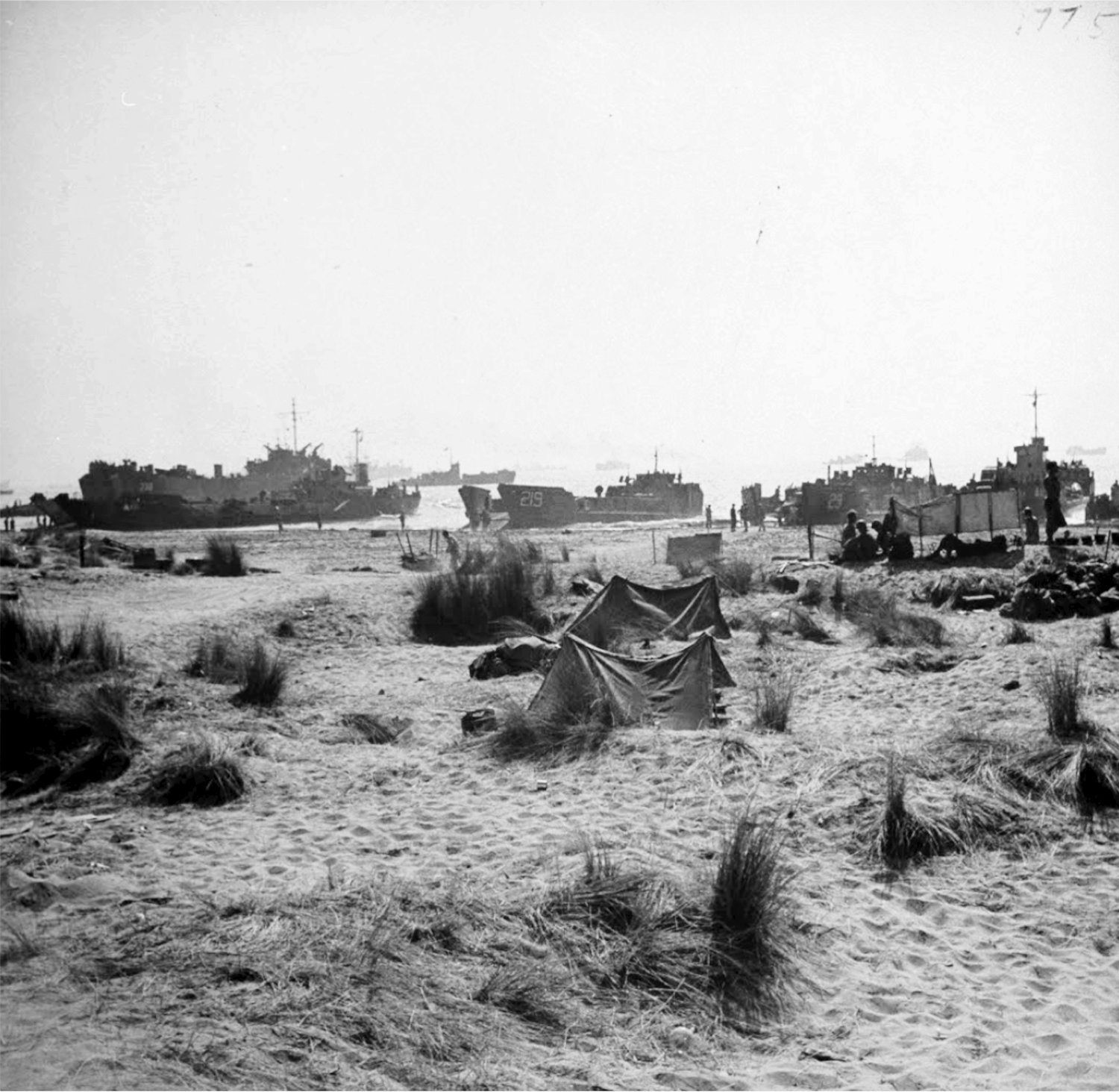 LCT(5)-29 unloading men, equipment and supplies across the Salerno, Italy beachhead, September 1943.