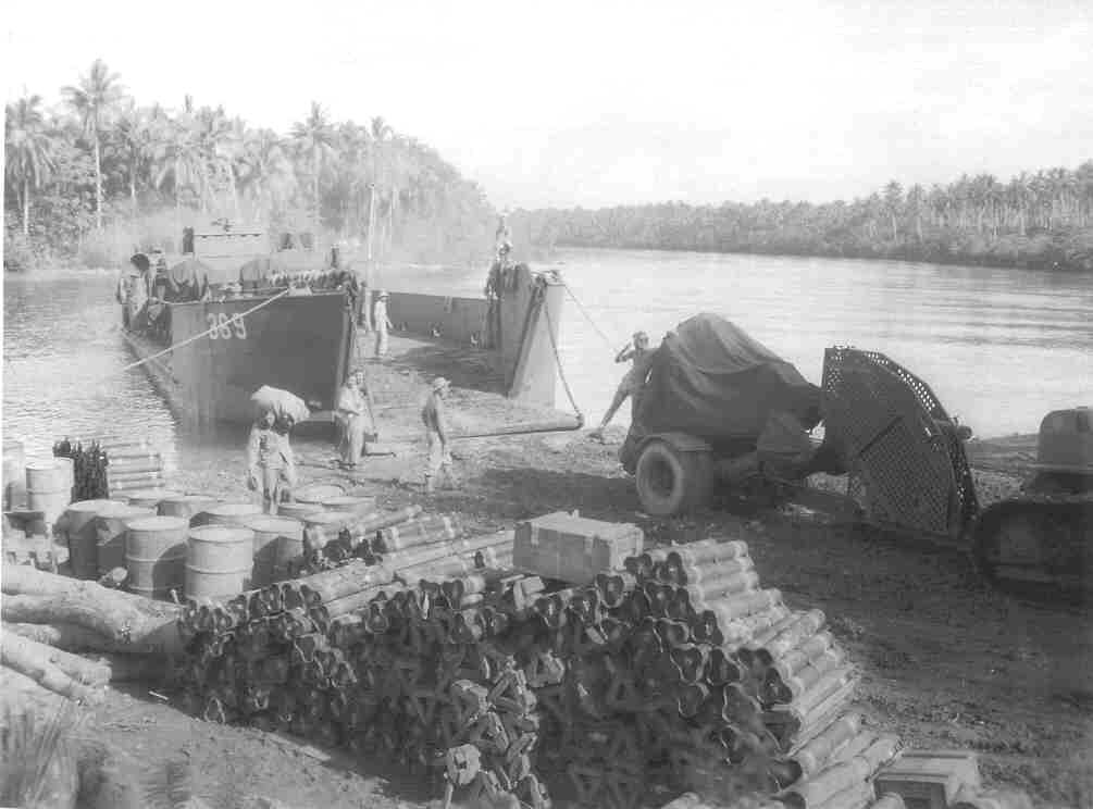 A U.S. Army 105mm howitzer motor carriage, M7 Priest, is being unloaded. Australian War Memorial, Photo No. 304859 |