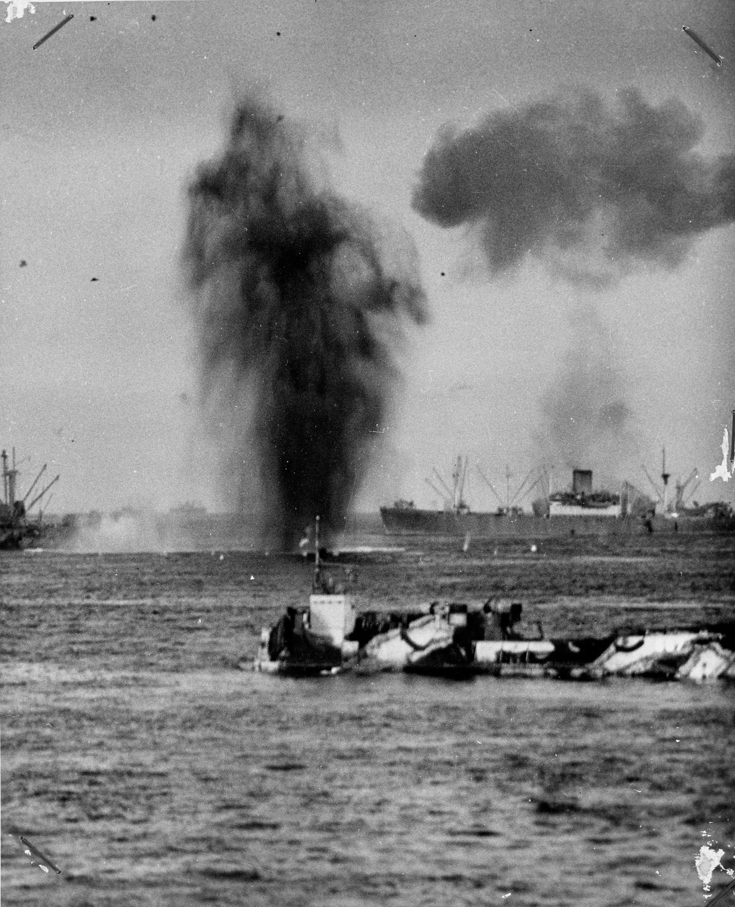 730k | LCT(6)-687 off the Leyte beachhead as Japanese aircraft bomb the invasion fleet in October 1944. Note the flak spotting