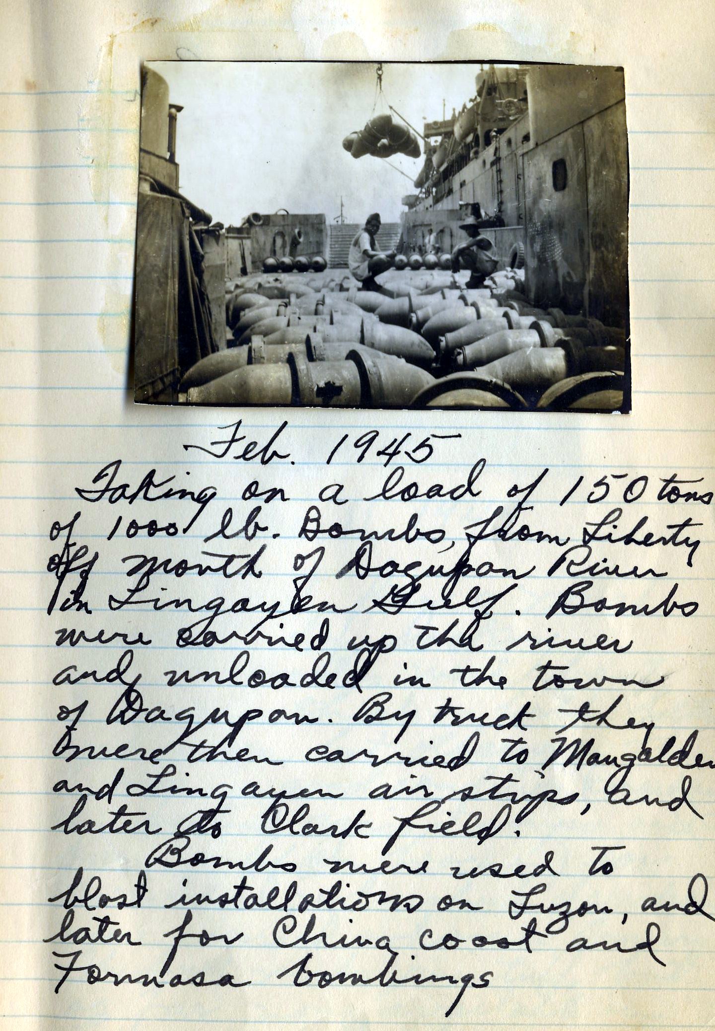 664k | During February LCT(6)-732 unloaded bombs from cargo ships in Lingayen Gulf and transport them up the Dugran River to Dugran City where they were unloaded and transported over land to local air strips. | Joel Miller for his father LT. Milford Braxton Miller, Skipper, LCT-732 | |