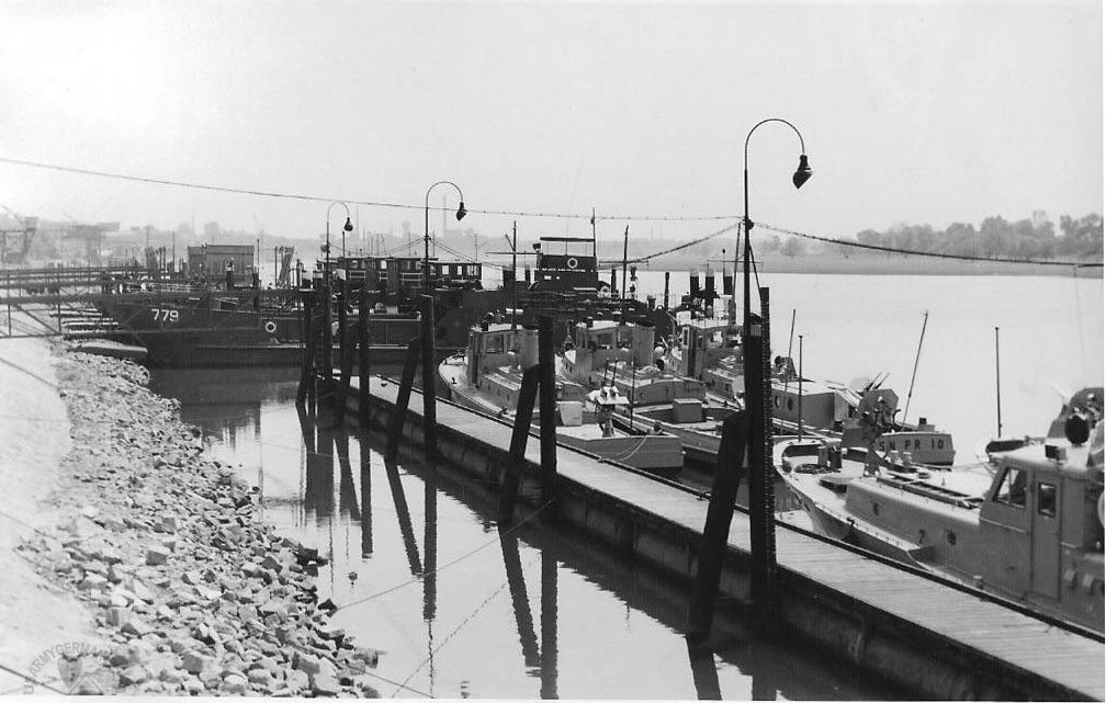 A good view of the types of craft assigned to Unit M for the patrol and ferry mission along the unit's segment of the Rhine River. Tied up