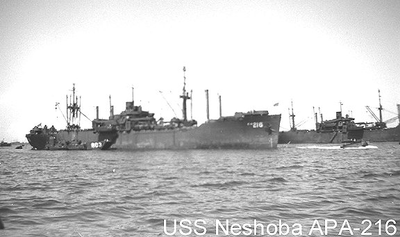 43k | LCT(6)-803 alongside USS Neshoba (APA-216) as she rides at anchor in the harbor at Guam, February 1946. | Larry Brooks for his father C. Carroll Brooks SF1/c USS Neshoba passenger. | |