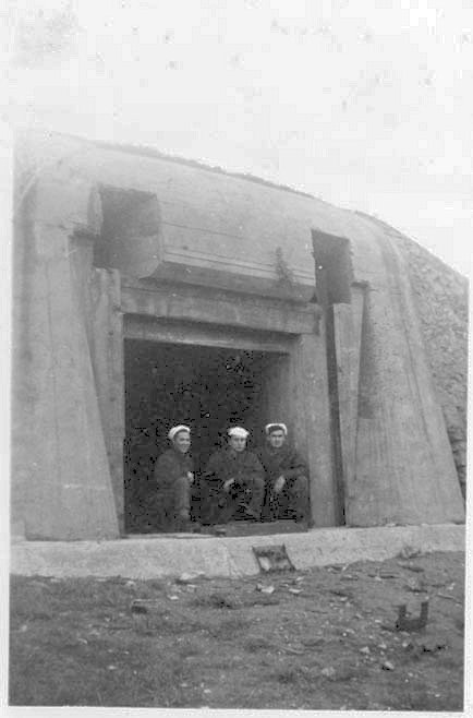 39k | LCT(6)-811 crew members, Thorne (left), Juhasz (center) and O'Leary (left) pose in front of a German pillbox on the French coast, date unknown. | Photo by James Procops BM2/c, LCT(6)-811 | |