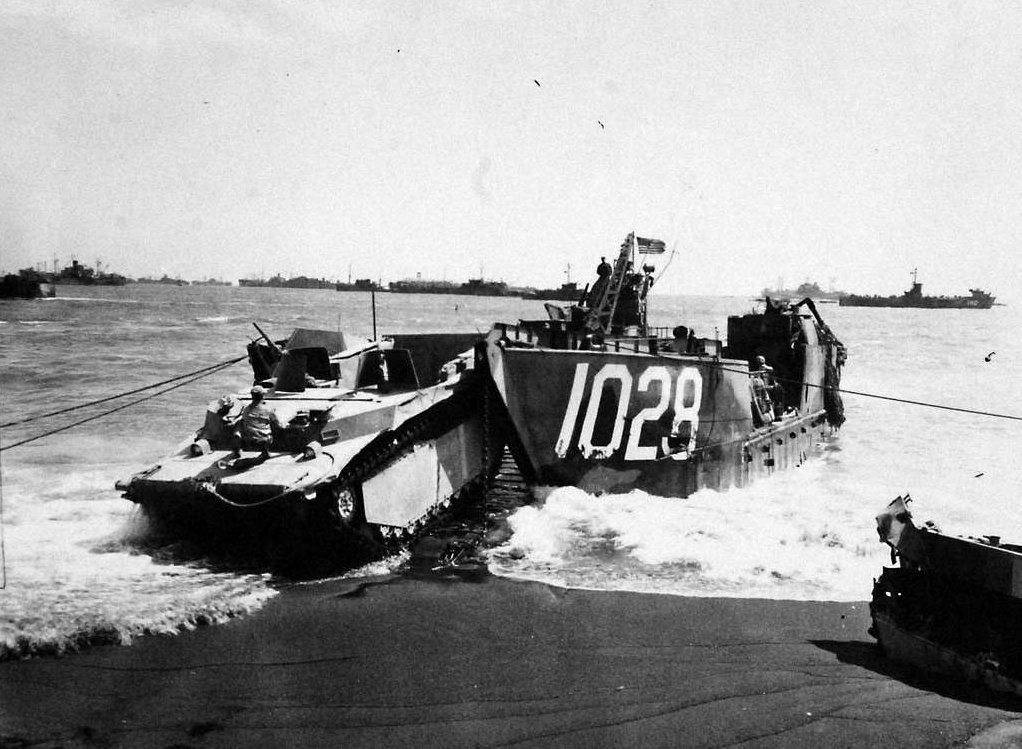 100k | LCT-1028 is underway just off the invasion beach at Iwo Jima while USS LSM-202 has beached to allow Marines to unload supplies on D-Day 19 February 1945. US Marine Corps photo from "Leatherneck" magazine. |