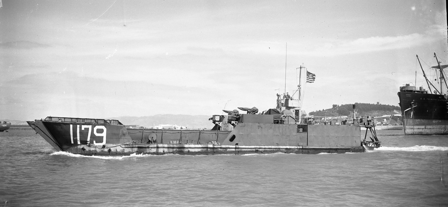 166k | LCT(6)-1179 underway in San Francisco Bay off Naval Station Treasure Island, date unknown. In the center background the large white building is the old Pam American flying boat terminal on Treasure Island and on the right Yerba Buena Island. Also in the photo at anchor is the merchantman SS Trinity Victory (bow visible) astern of LCT(6)-1179 and far left background USS Seminole (AKA-104). | Darryl Baker | |