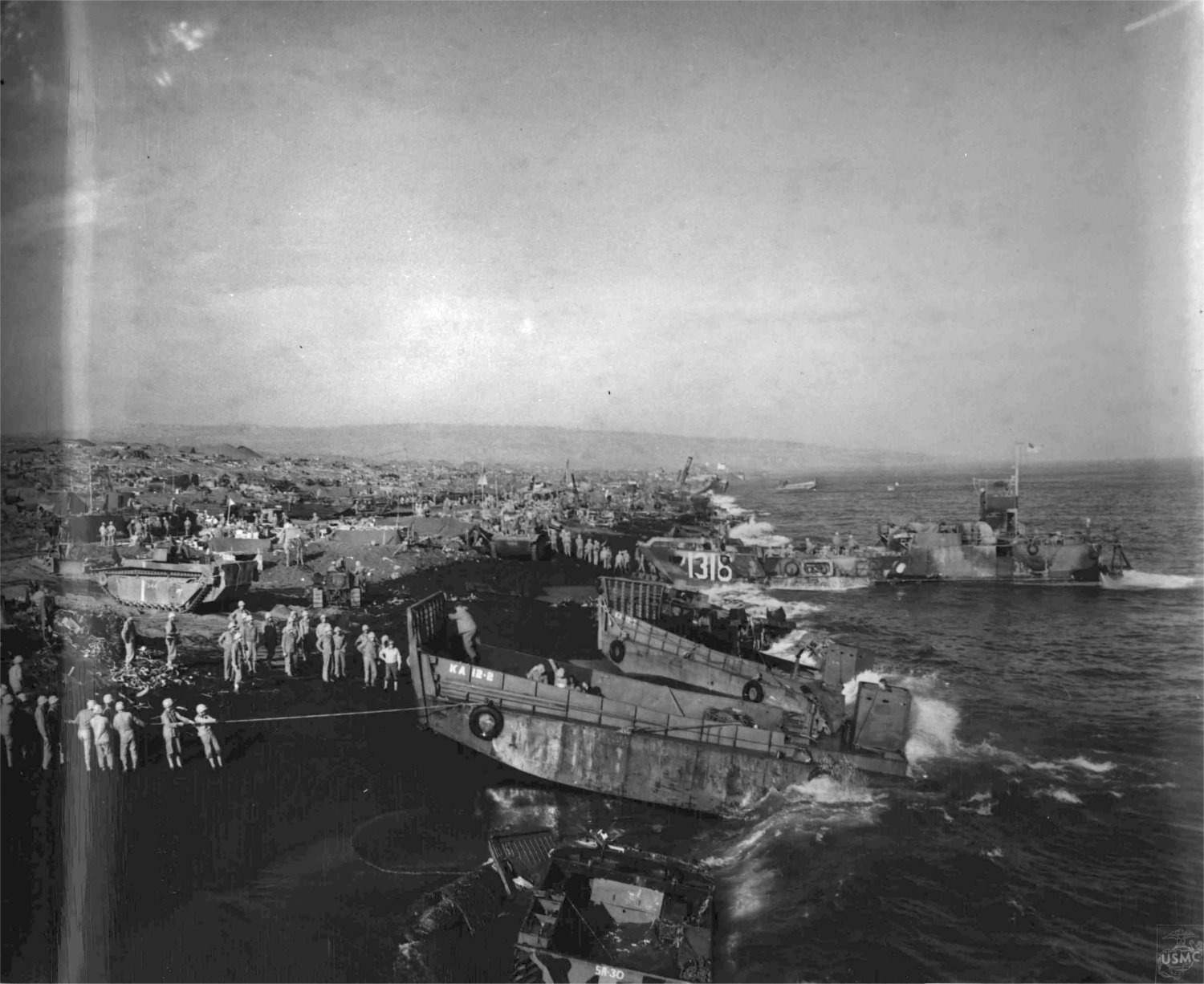 257k | LCT(6)-1318 beached at Iwo Jima, as Marines, work in the deep sands of the beach unloading ammunition, food and water for the