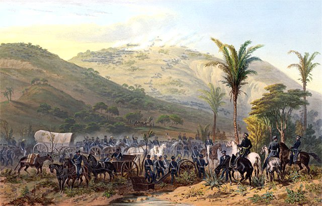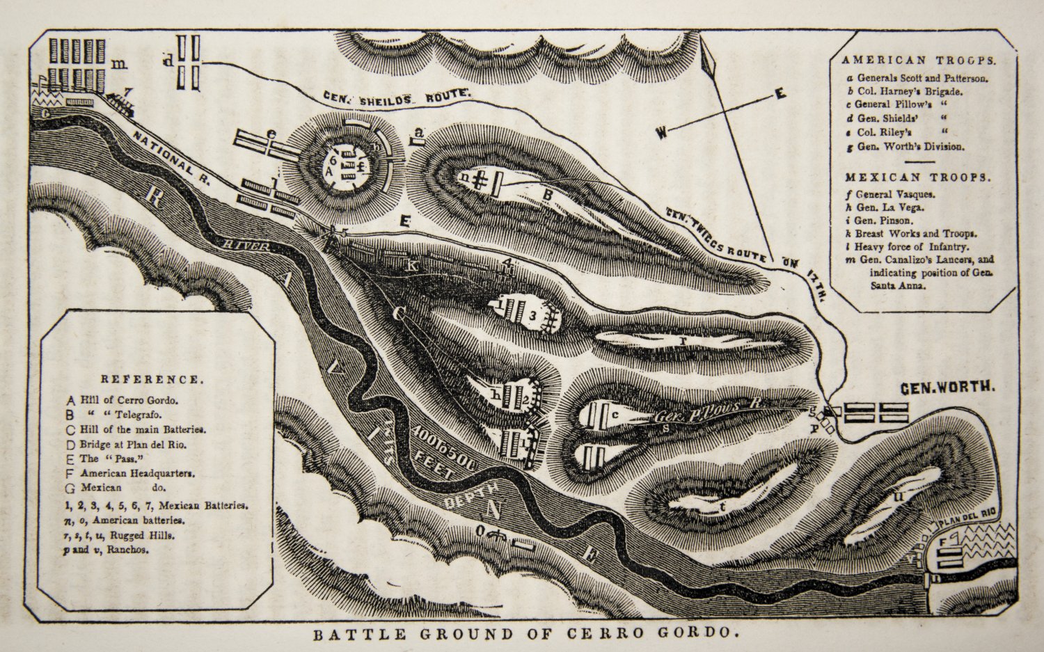 77k | Photo - Painting by Carl Nebel (1851) "Battle of Cerro Gordo during the Mexican-American War", Published in the 1851 book "The War Between the United States and Mexico, Illustrated". Lithograph by Adolphe Jean-Baptiste Bayot (1810–1866) after a drawing by Carl Nebel (1805–1855) (Wikipedia) Map - A Continent Divided The U.S. - Mexican War The Battle Ground of Cerro Gordo University of Texas Arlington Library | Tommy Trampp | |