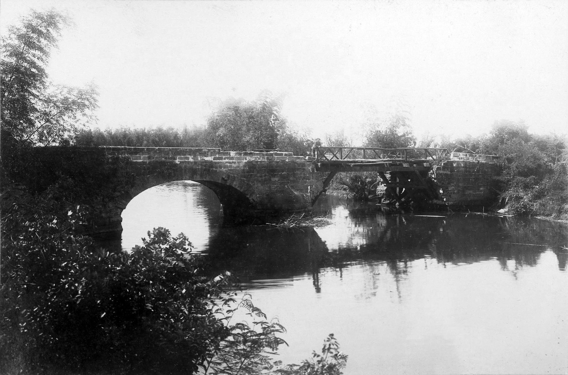 453k | The reconnected Zapote River Bridge in 1899 being guarded by an American soldier taken after the battle of 13 June 1899 between Filipino and American soldiers during the Philippine-American War. One span of the bridge was removed by the locals and substituted by a wooden span, which was burned down, on or before the fighting. University of Michigan Library: The reconnected Zapote River Bridge in 1899 |