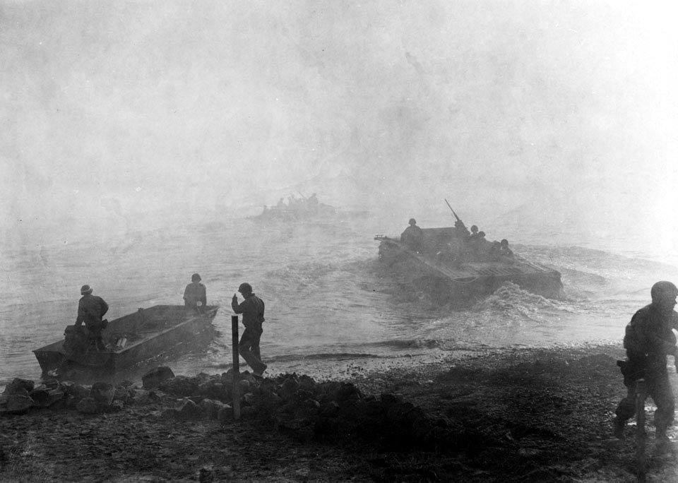 Photo - US 9th Army amphibious vehicles cross the Rhine under a smokescreen, March 1945. National Army Museum, UK.