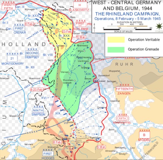February 8 the Canadian First Army (Henry Crerar) launched Operation Veritable, a major attack southeast from Nijmegen, Holland, between the Meuse and the Rhine.