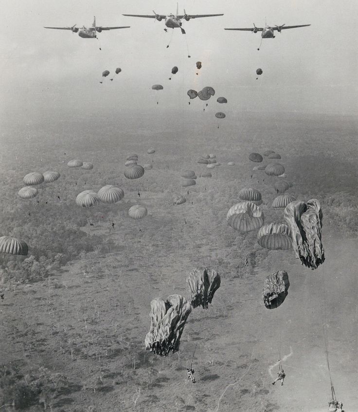 Photo - Parachute jump by elements from 173rd Airborne Brigade, during Operation Junction City, Troops were dropped by Fairchild C-123 Providers. Operation Junction city (22 February –