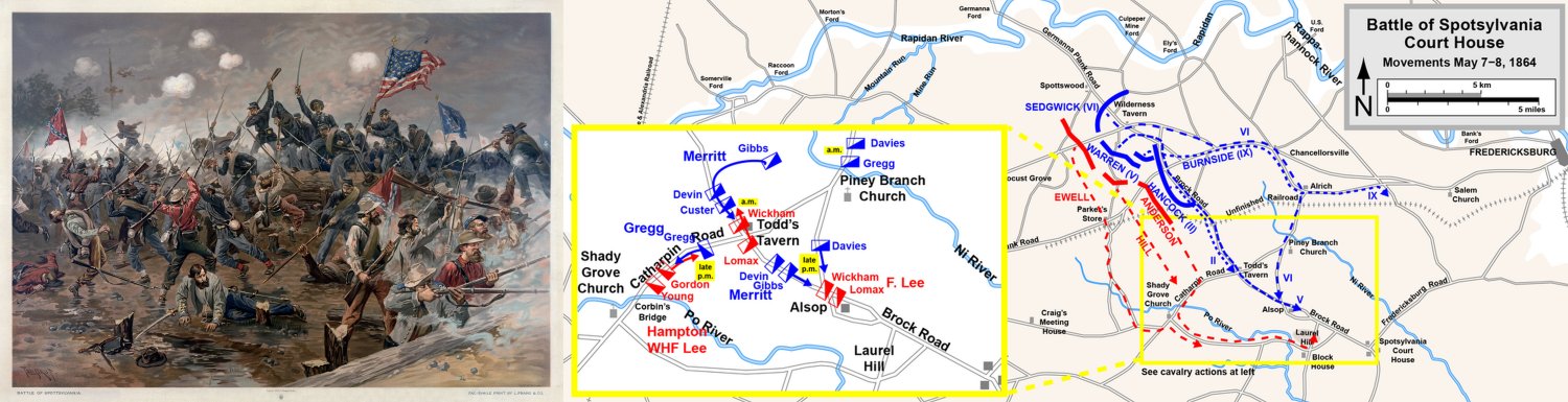 165k | Photo - "Battle of Spotsylvania" - created in 1887 by Thure de Thulstrup (1848-1930), U.S. Library of Congress's Prints and Photographs division, digital ID pga.04038 Map - Battle of Spotsylvania Movements May 7-8, 1864 - Hal Jespersen |