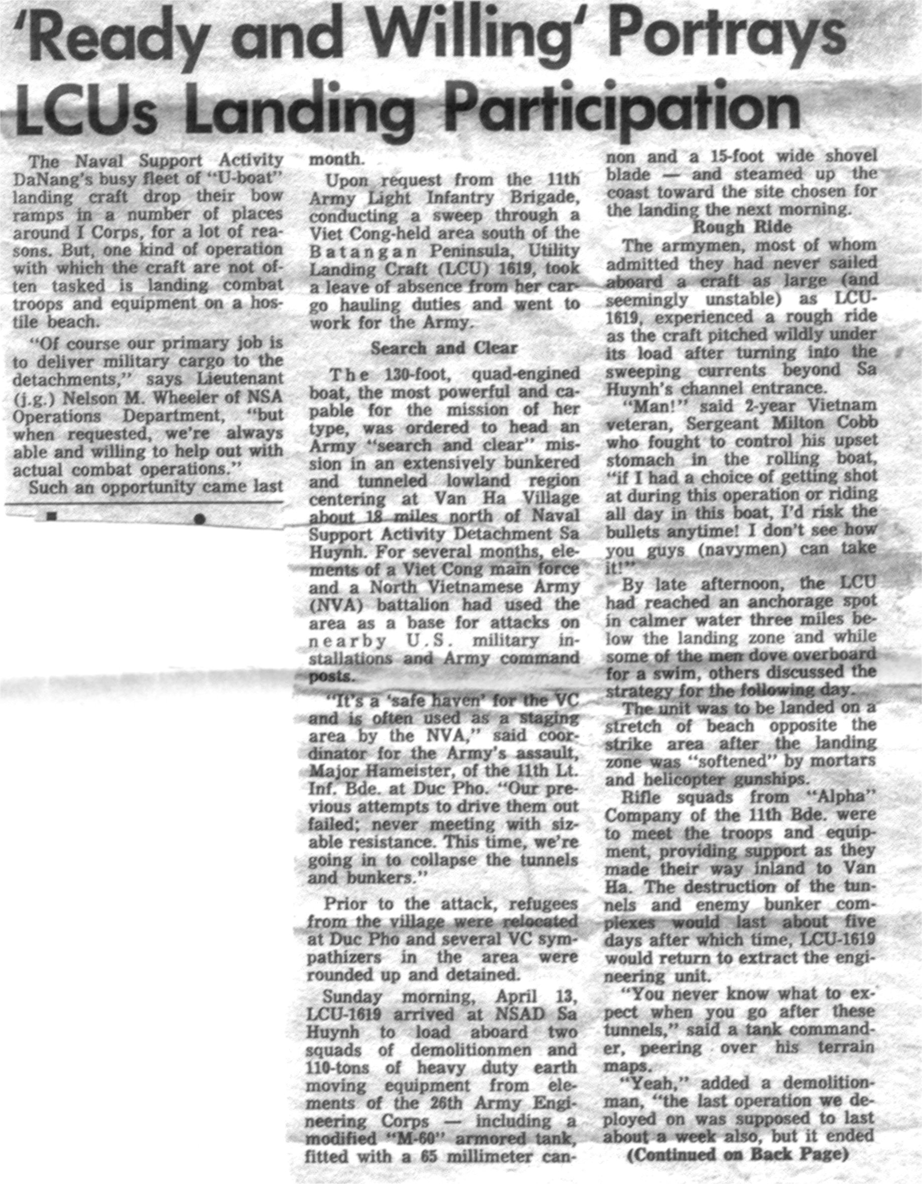 153k | LCU-1619 and an unidentified YFU at the ramp at Sa Huynh, South Vietnam in the southern section of I-Corps. | Photo by Tom Lanagan YFU-79 | |