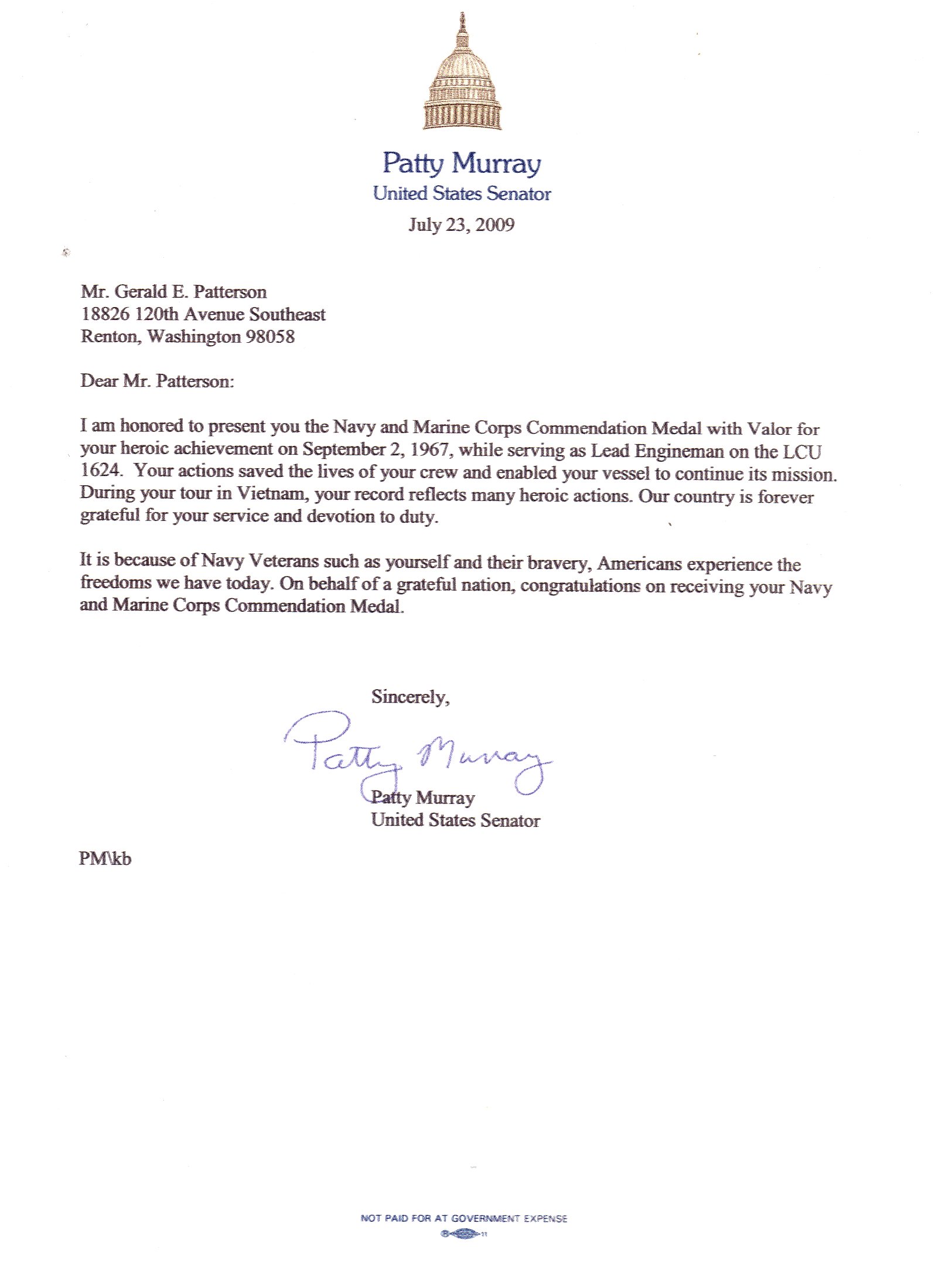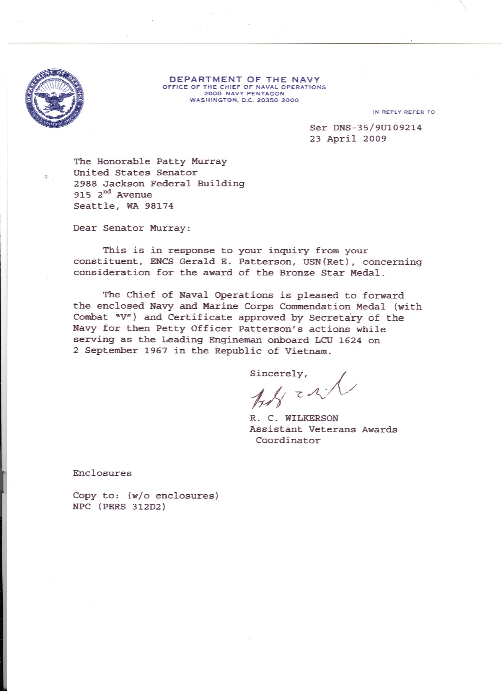 Gerald E.Patterson EN1 USN (see correspondence and award ceremony photos below) | Citation |
