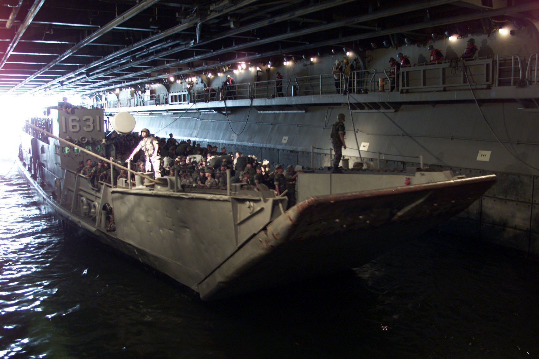 99k | LCU-1631 entering the well deck of a large amphibious ship (LSD, LPD, LHA, LHD), location and date unknown. US Navy photo from the Global Security web site. |