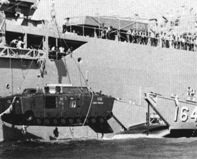 245k | A LVT-5 is hoisted aboard LCU-1641, circa 1973. The LVT-5 sank off Vieques Island, Puerto Rico, and was raised