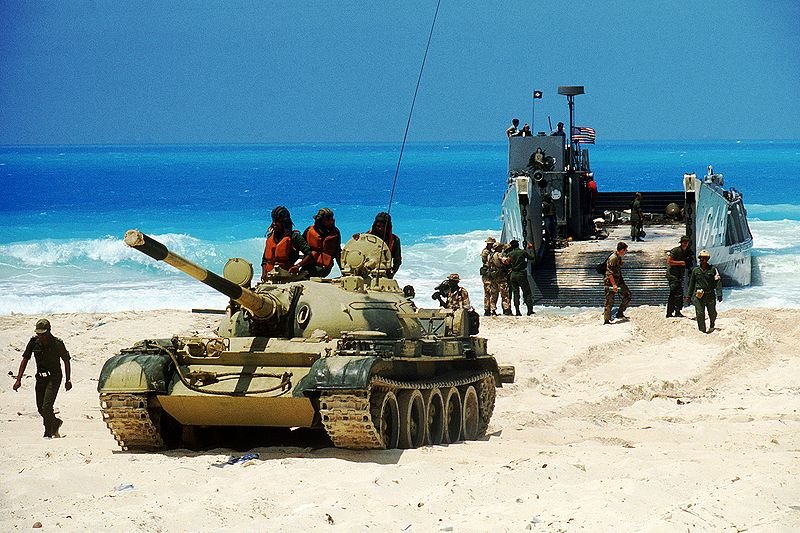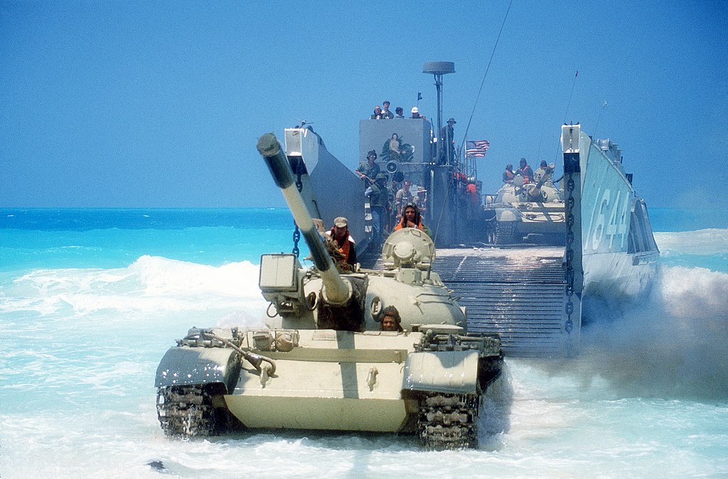 115k | An Egyptian T-55 tank comes ashore from the utility landing craft LCU-1644, 8 August 1985, at Alexandria, Egypt during an amphibious assault in support of the multinational joint service Exercise Operation Bright Star. DOD photo # DF-ST-86-08086 by Capt. Mark Beberwyck |