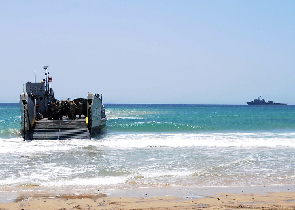 122k | The bow ramp of utility craft LCU-1644 from the amphibious assault ship USS Nassau (LHA-4) descends as troops and vehicles prepare to hit the beach during training Exercise Sea Soldier III in support of Operation Desert Shield. (At Ras-Madrakah, Oman 1990). US Navy photo. |