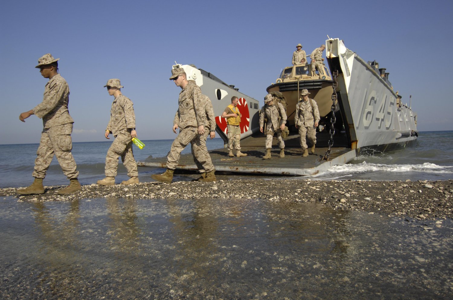 289k | Marines assigned to the 24th Marine Expeditionary Unit (24th MEU) disembark from LCU-1645 to provide personnel and supplies to assist with humanitarian and disaster relief operations as part of Operation Unified Response after a 7.0 magnitude earthquake caused severe damage in and around Port-au-Prince, Haiti Jan. 12. Note the shark mouth painted on the starboard wall of the tank deck. US Navy photo # 100203-N-8936G-077 PORT-AU-PRINCE, Haiti (Feb. 3, 2010) by MC2 Patrick Gordon. |