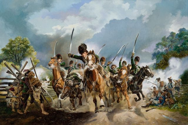 67k | Photo - Tarleton's British Legion Cavalry attacking Sumter's men at Catawba Ford along the Catawba River in Chester County, SC. Friday, August 18, 1780. By: C.W. Roden