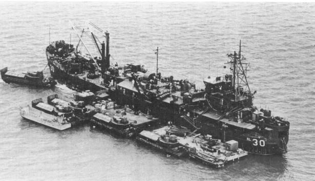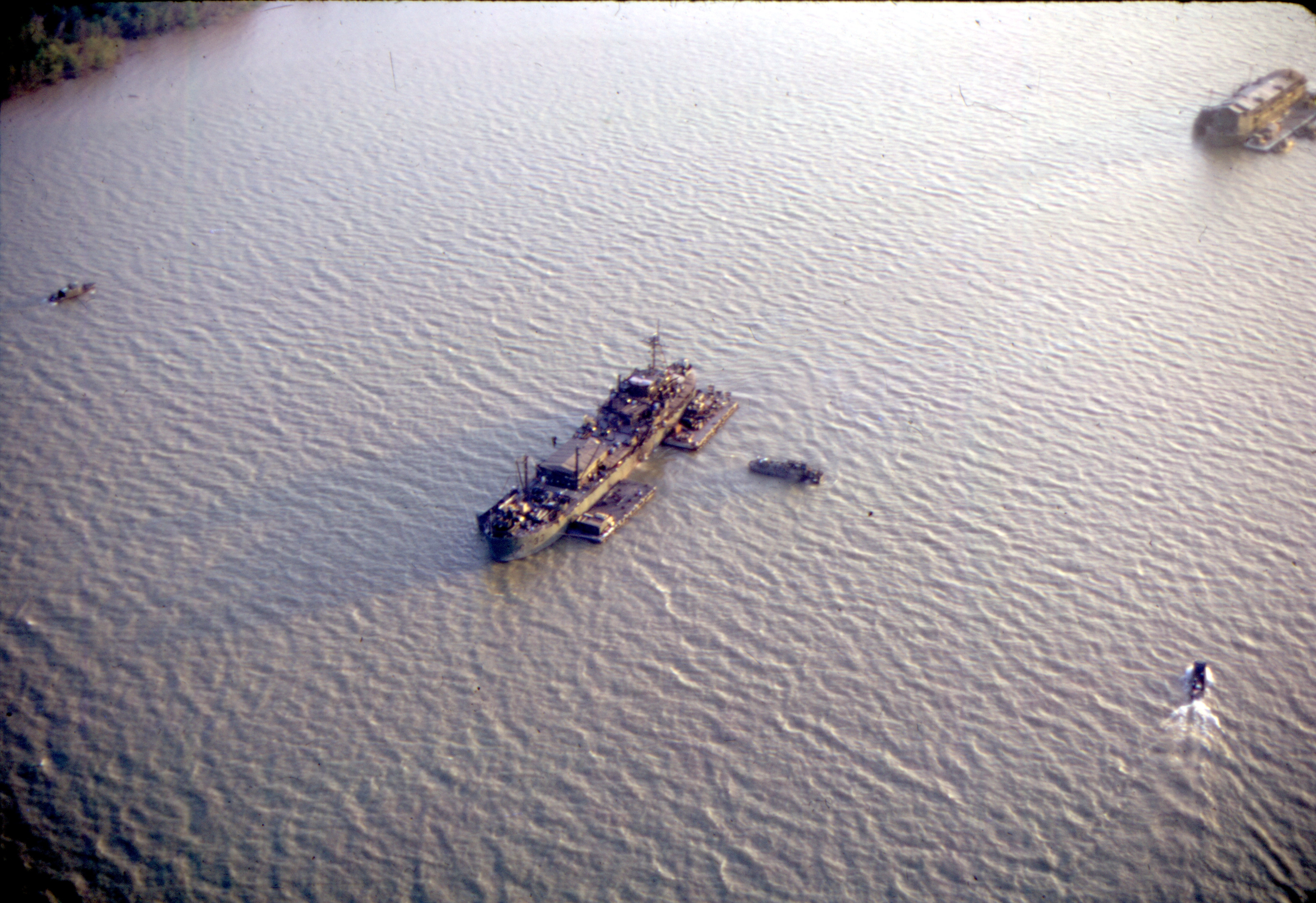 her "A" frame hoist to lift a 56-foot Armored Troop Carrier onto a pontoon for maintenance. Other riverine craft, including a monitor, await their turn. The full load