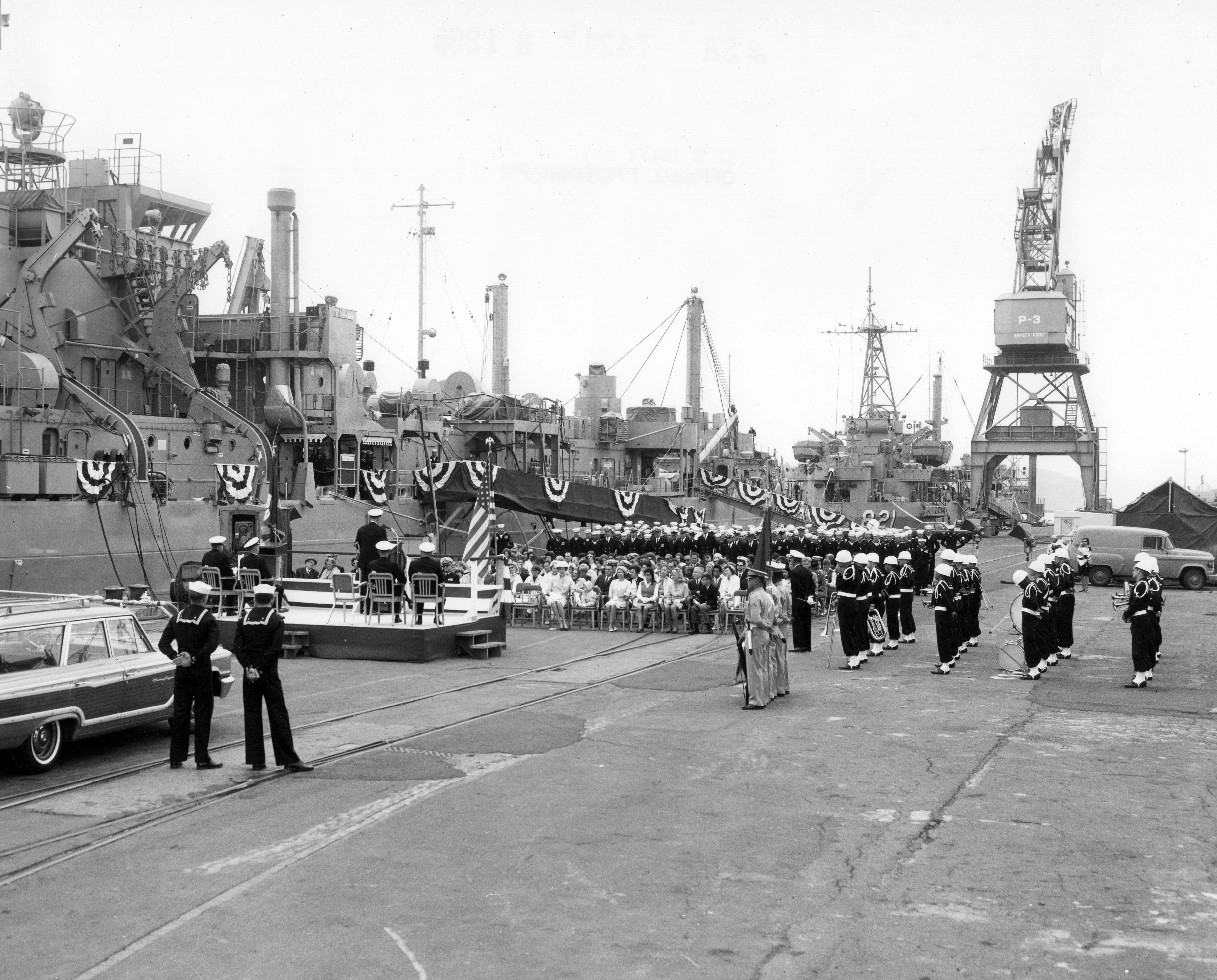 1803k | USS Askari (ARL-30) recommissioning ceremony at Mare Island Naval Shipyard, Vallejo, CA., 13 August 1966. Note USS Harnett County (LST-821) moored forward of Askari. Harnett County was recommissioned 7 days later on 20 August 1966. File name: ARL 30 74217-8-66, Navy Photo, 8/13/66 | Darryl Baker | |