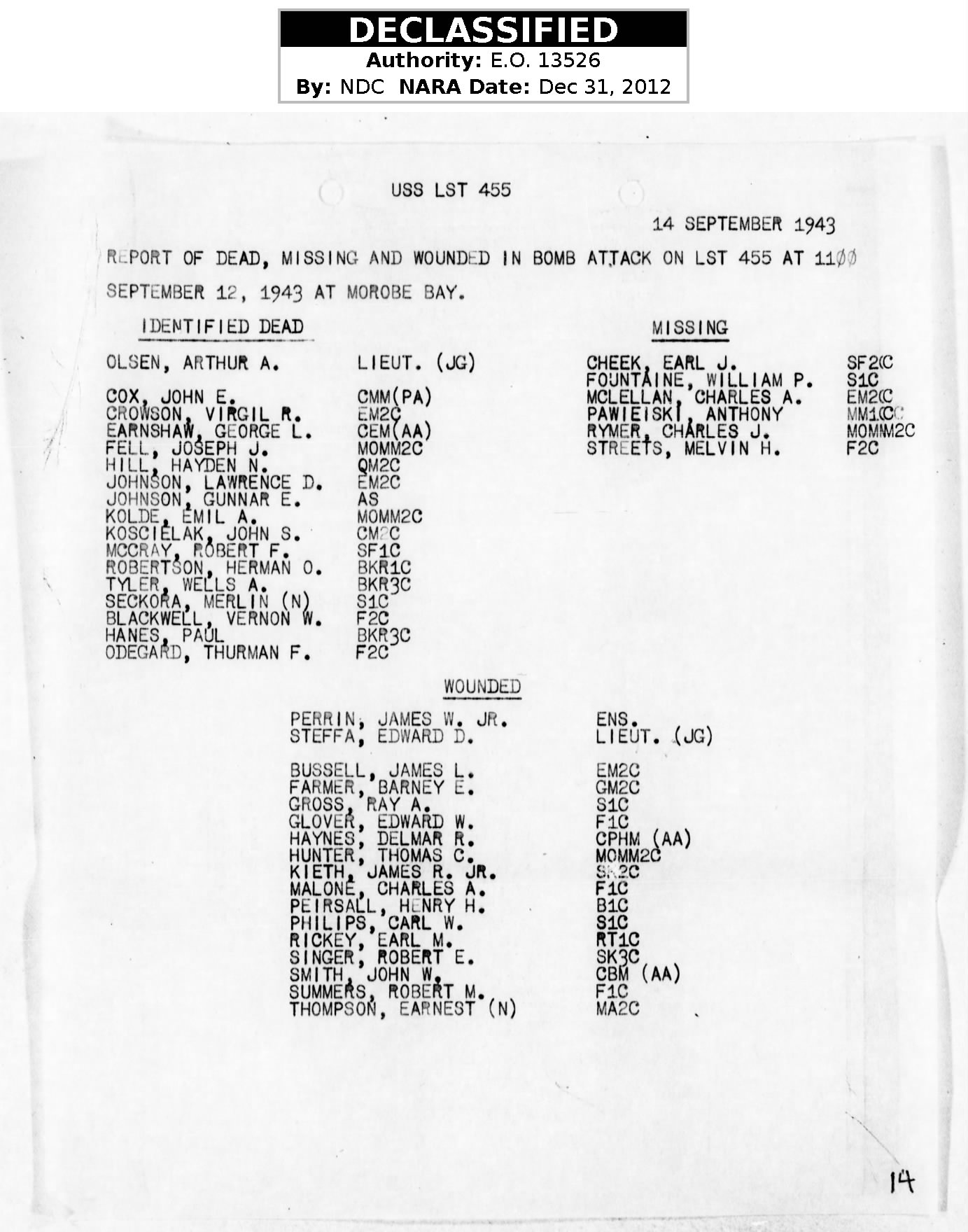 240k | Report of dead, missing and wounded in bomb attack on USS LST-455 at 1100 September 12, 1943 at Morobe Bay. On about 1100 hours September 12, 1943, LST-455 was attacked while anchored at Morobe, New Guinea by Japanese aircraft. Three bombs of about 300 pounds each were dropped from about 300 feet . The first bomb hit the shore 100 yards ahead of the ship, the second bomb exploded off the port bow, the third hit the vent at frame 41 passing through the galley and exploded in the crew's quarters. The quarters and galley caught fire which exploded gas drums in the rack on the port side of fantail. Fires were put out by 1135 hours. USS LST-455 War Diary action report dated Sep. 1-30, 1943 page 14. | David Upton | |