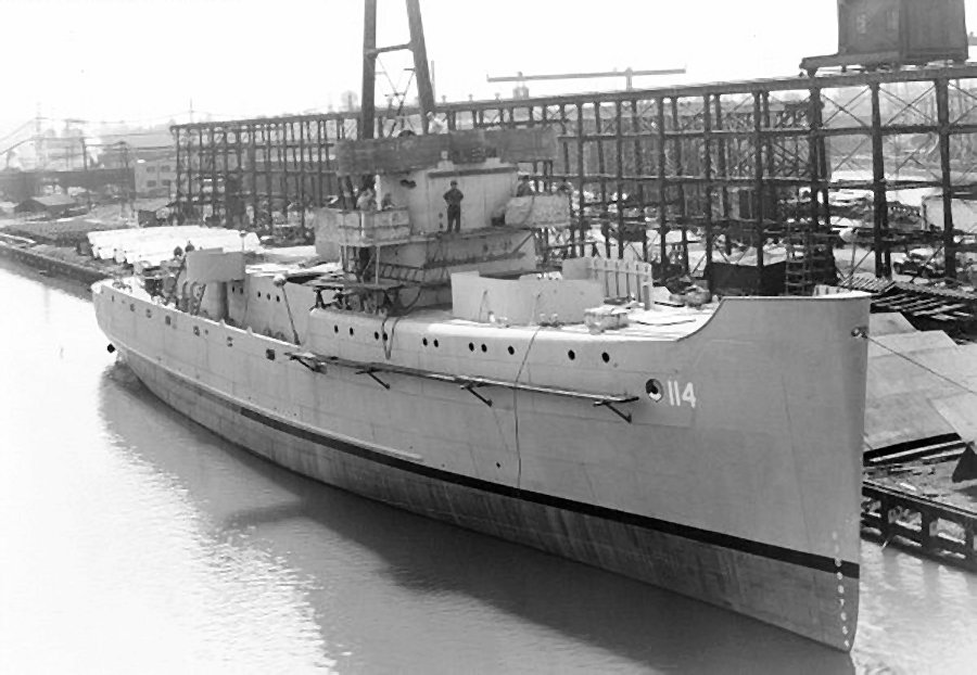 123k | Underway in the vicinity of Hampton Roads, Virginia, on 22 February 1944, following repair of mine damage received during the Sicily operation on 16 July 1943. Photograph was taken from a Naval Air Station Norfolk, plane, flying at 200 feet altitude. U.S. Navy Photo 80-G-224589 |