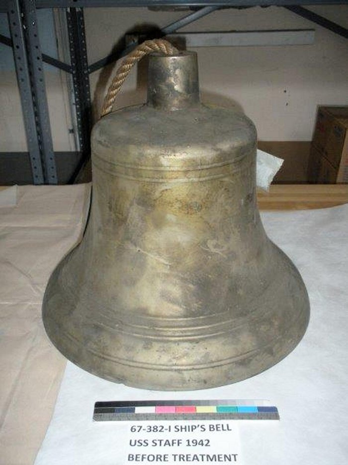 93k | Ship's bell prior to treatment Photo 67-382-1 from the collection of Curator Branch: Naval History and Heritage Command |