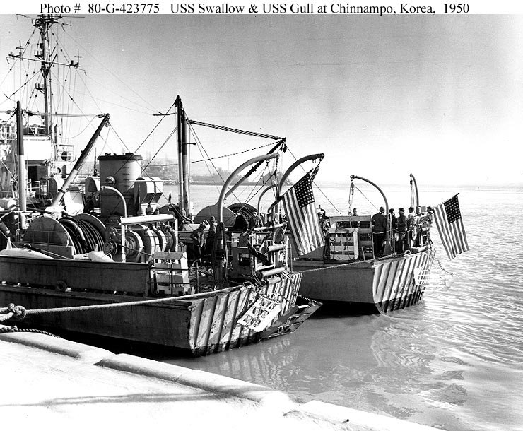 Swallow and Gull (AMS 16) tied up at Chinnampo, North Korea, in November 1950, after taking part in clearing a channel more that sixty miles inland from the Yellow Sea and up the Taedong River to Chinnampo. U.S. Navy photo 80-G-423775 |