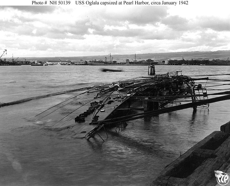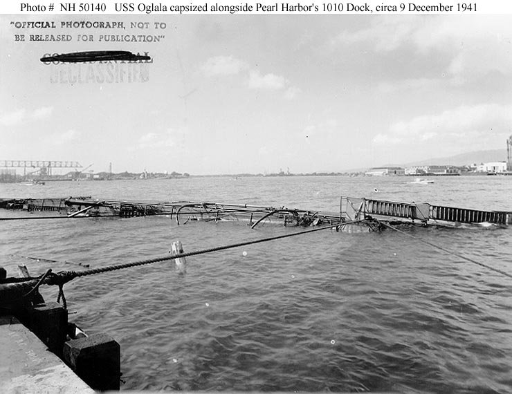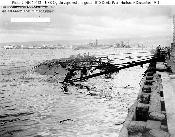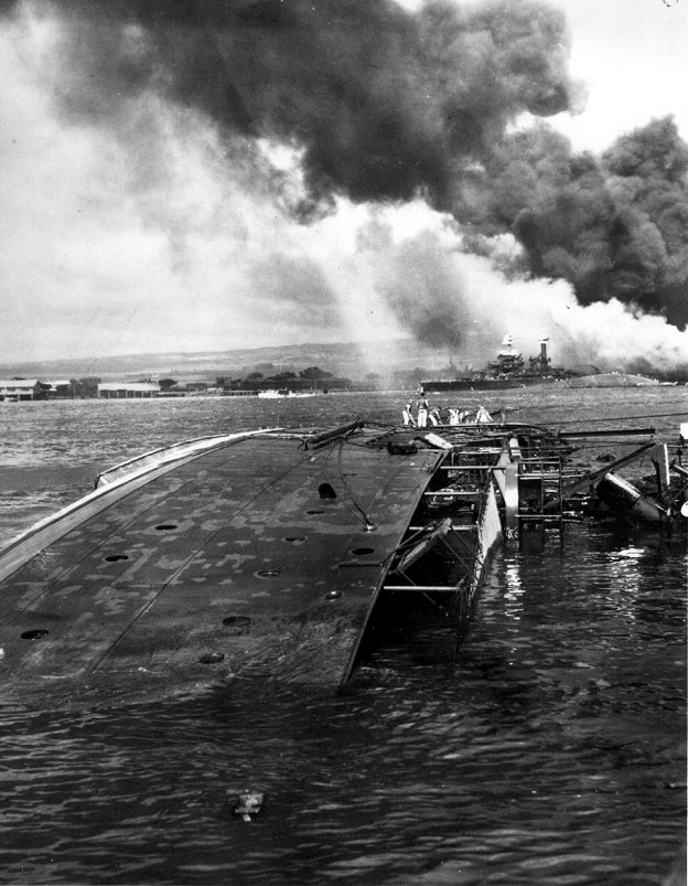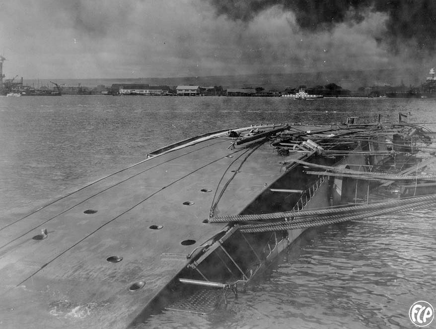 Original photo: c. December 1941 Capsized at 1010 pier, Pearl Harbor, HI Replacement photo: Lying on her side following the Japanese attack at Pearl Harbor, T.H., on 7 December 1941 National Archives photo 80-G-32537