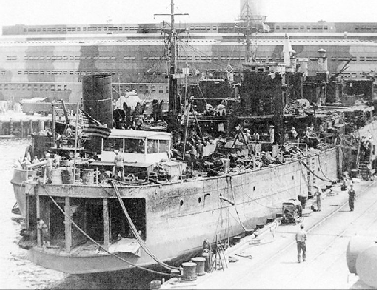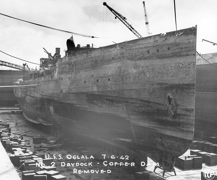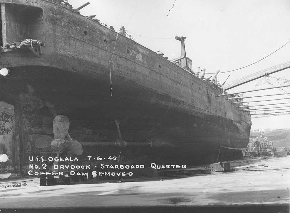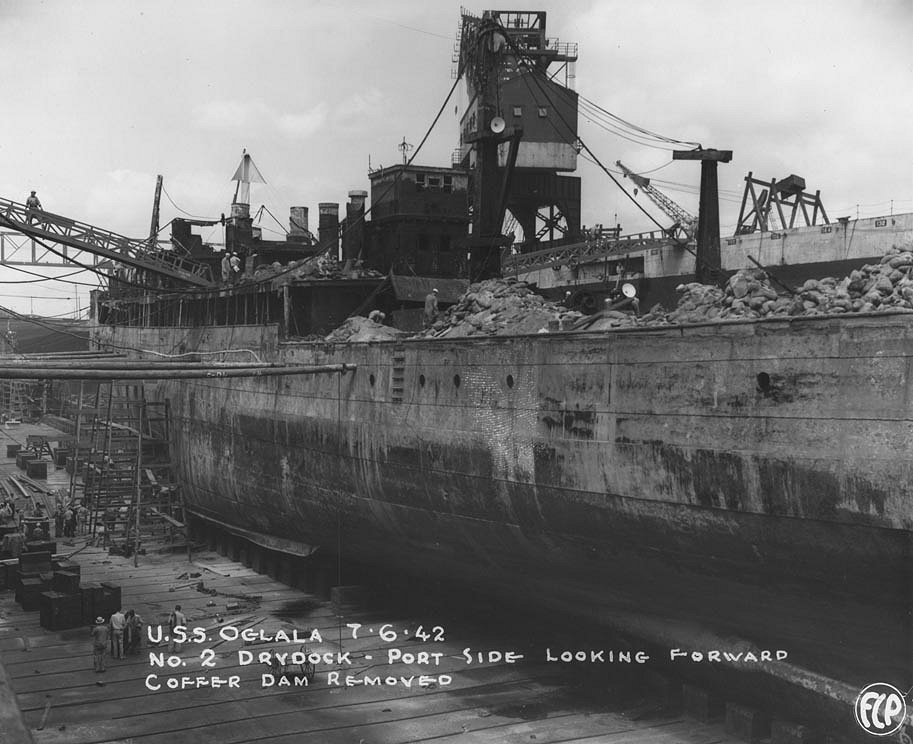 The Oglala is seen being pumped out for the second time. Several pumps failed on June 25, 1942, causing the ship to sink again. The battleship West Virginia and cruiser Northampton are seen in the upper part of the photo, occupying Dry-docks No. 1 and No. 2 National Archives photo |