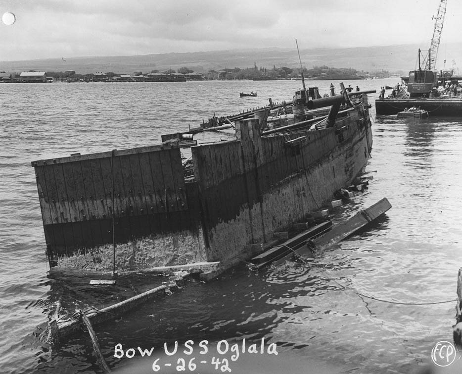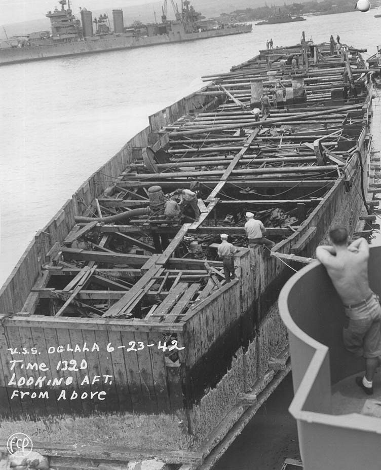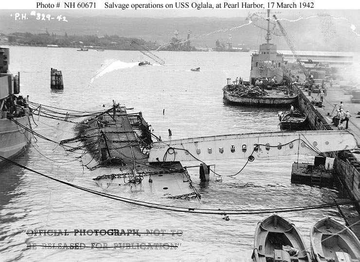 Capsized alongside 1010 dock at Pearl Harbor, with salvage work underway, 17 March 1942. Chains encircling her hull are part of the righting tackle. West Virginia (BB-48) and Arizona (BB-39) are sunk in the middle distance U.S. Navy photo NH 60671 |