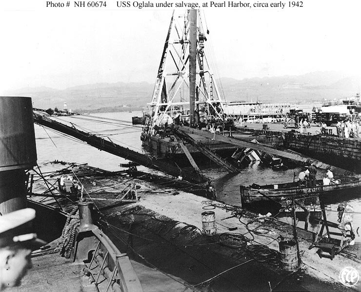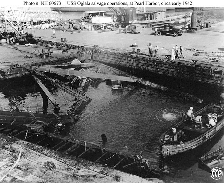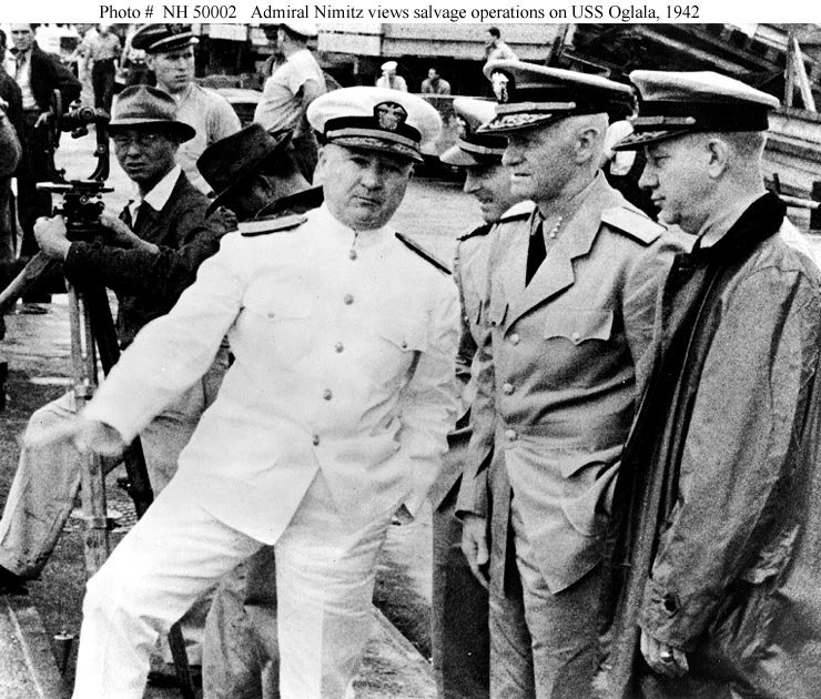 Admiral Chester W. Nimitz, USN, (center), Commander in Chief, Pacific Fleet, observes efforts to right the capsized Oglala (CM-4) at Pearl Harbor. With him are Rear Admiral William R. Furlong (left), Commandant, Pearl Harbor Navy Yard, and Captain Homer N. Wallin (right), who was in charge of the salvage operations. The photograph was taken in April - May 1942, possibly during the initial righting attempt on 11 April U.S. Navy photo NH 50002 |