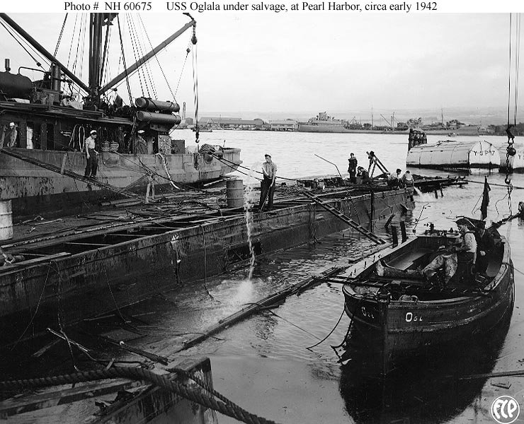 Salvage work underway at Pearl Harbor, circa early 1942. One of Oglala's motor launches is in the right foreground, with a diver embarked. Salvage pontoons (including YSP-17) are in the background, and an oiler is by the Ford Island gasoline wharf in the distance U.S. Navy photo NH 60675 |