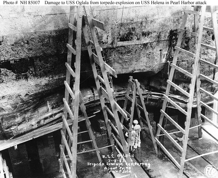 Closeup view of torpedo damage to the ship's port side midships hull, taken 4 July 1942 in drydock at the Pearl Harbor Navy Yard. Oglala was not herself directly hit. The heavy damage to her hull seen here was caused by the explosion of an aerial torpedo on Helena (CL-50), which was alongside some eight feet distant from Oglala. Courtesy of the Naval Historical Foundation Collection of The Honorable James V. Forrestal U.S. Navy photo NH 85007 |