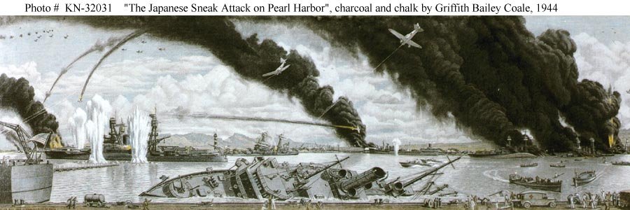 "The Japanese Sneak Attack on Pearl Harbor." Charcoal and chalk by Commander Griffith Bailey Coale, USNR, Official U.S. Navy Combat Artist, 1944. Courtesy U.S. Navy Art Center, Washington, DC U.S. Navy photo KN-32031 |