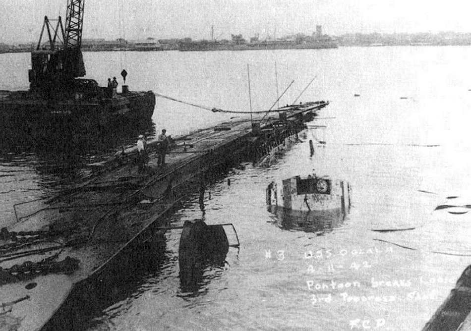The first attempt to refloat the Oglala fails on April 11, 1942, as the pontoons break free of their chains. National Archives photo |