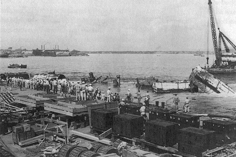 View looking toward 1010 Dock, with Oglala capsized in the foreground. To the left is Argonne (AG-31), with Sacramento (PG-19) barely visible beyond her From the collection of Vice Admiral Homer N. Wallin U.S. Navy photo NH 83066 |