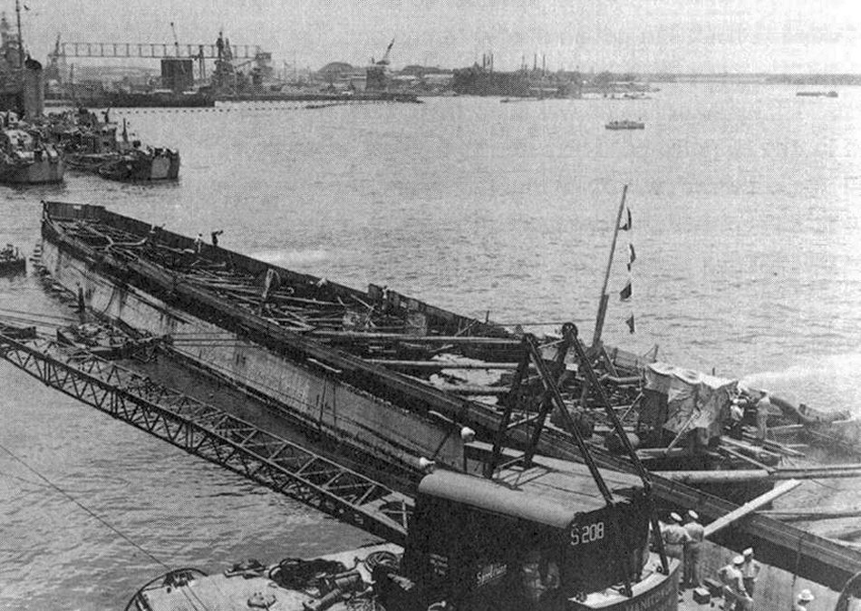 Salvage pontoons (with YSP-13 among them) surfacing during the initial attempt to right the ship, 11 April 1942. This effort failed when some of the pontoons broke loose from their righting bridles. The barge Guam 3201 is at left, with a mobile crane on board U.S. Navy photo NH 64492 |