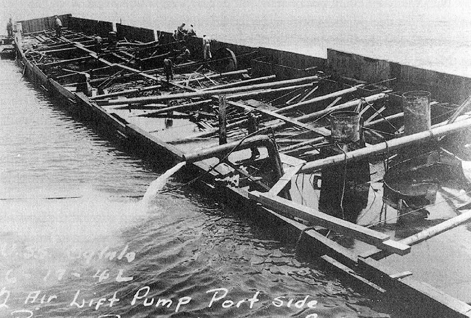 Pacific Bridge employees check the Oglala's cofferdam sections for leaks, as pumps dewater the ship. National Archives photo |