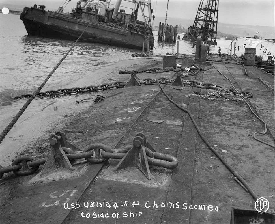 5 April 1942 Chains attached to hull with YSP-17 astern National Archives photo, San Francisco Regional Branch, Pearl Harbor Navy Yard General Correspondence 1941-45 |