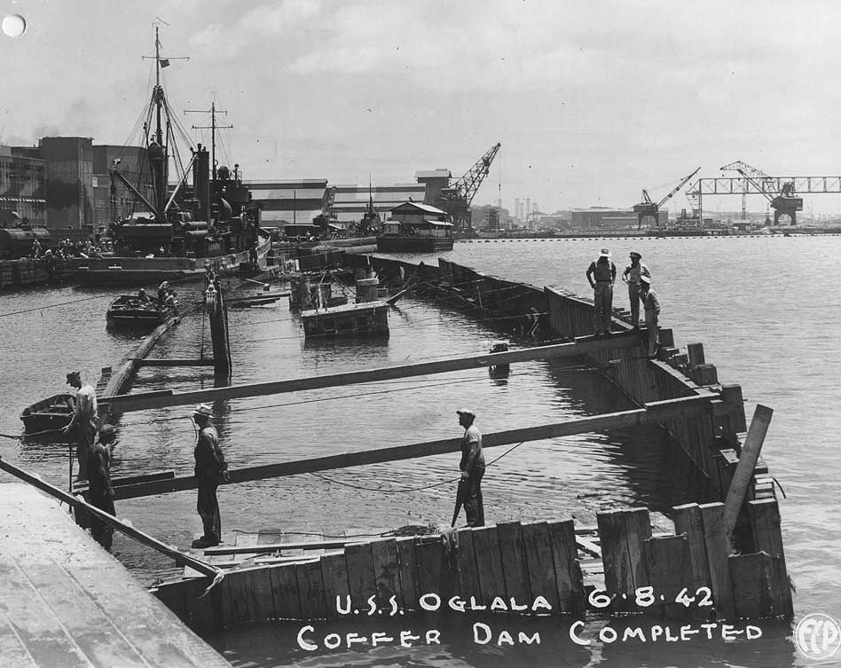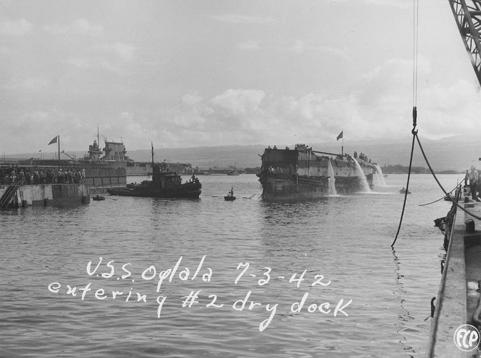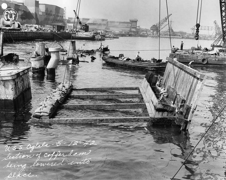 The Oglala is seen on 3 July 1942 being eased into Dry-dock No. 2. The cofferdam assembly, weighing 600 tons, can be easily seen here. The pumps are working to keep ahead of the flooding still occurring. The aircraft carrier Saratoga is moored at Ford Island in the background National Archives photo |