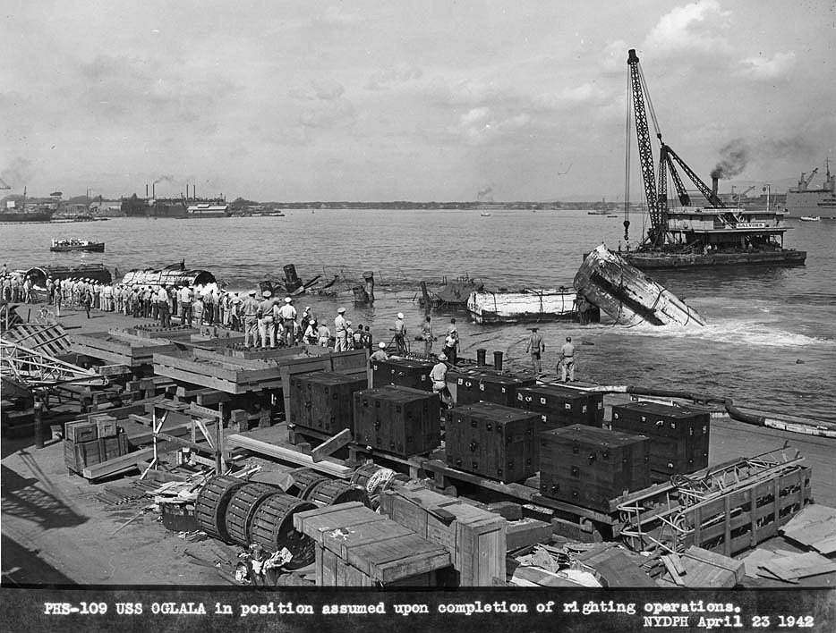 The Oglala is righted alongside the 1010 dock on 23 April 1942. Some of the pontoons are visible, having already come to the harbor surface. National Archives photo |