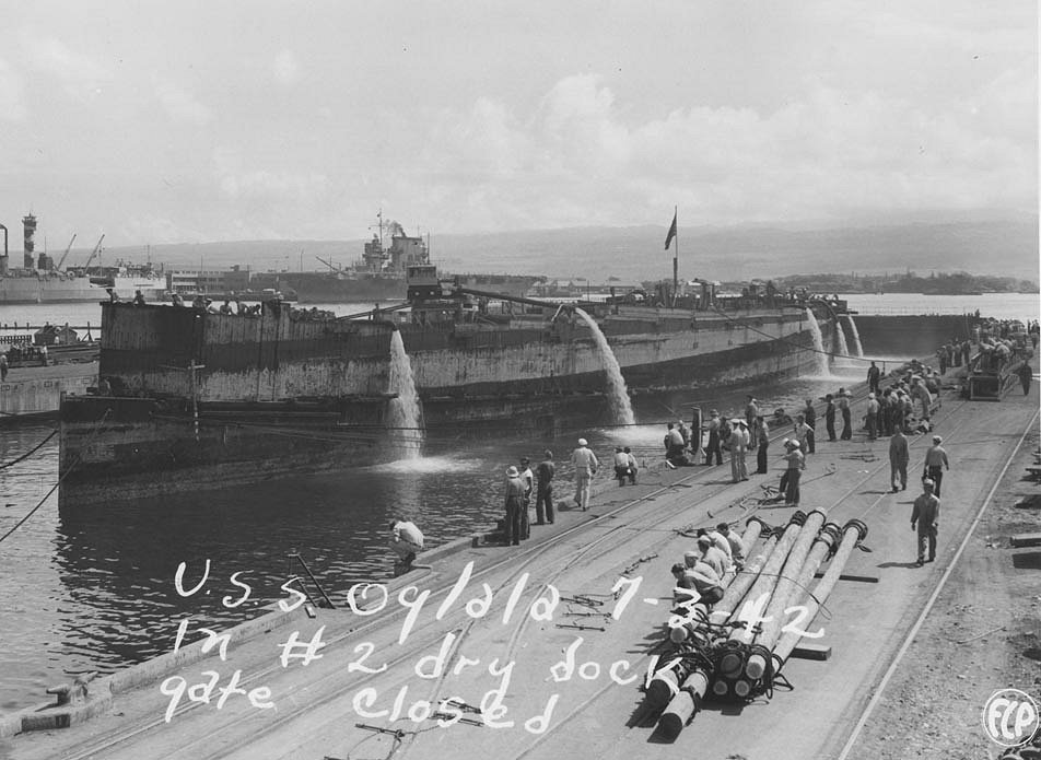 At the Pearl Harbor Navy Yard in mid-1942, after she was salvaged U.S. Navy photo NH 64236 |