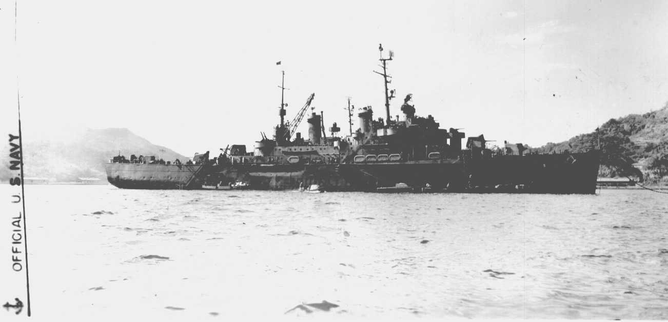 High speed transport Laning (APD-55) is moored in the background, undergoing conversion to a UDT flagship, which was completed 11 August.